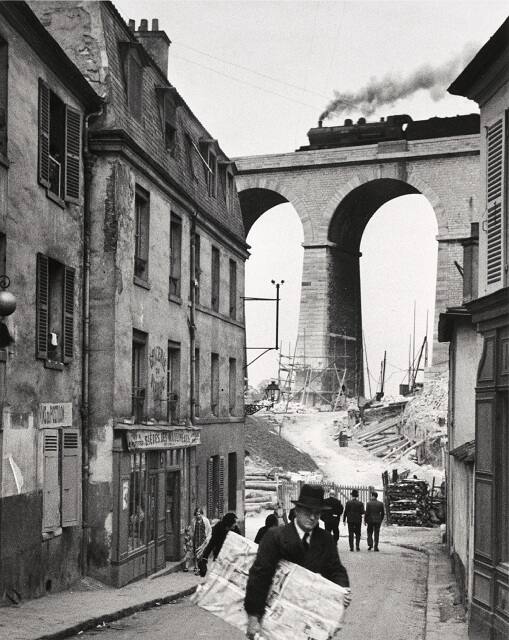 DescriptionImage of a street scene in the Paris suburb of Meudon. In the foreground a man walks toward the camera with a wrapped package under one arm. In the upper background, a train is passing on an elevated stone viaduct.Exhibition History