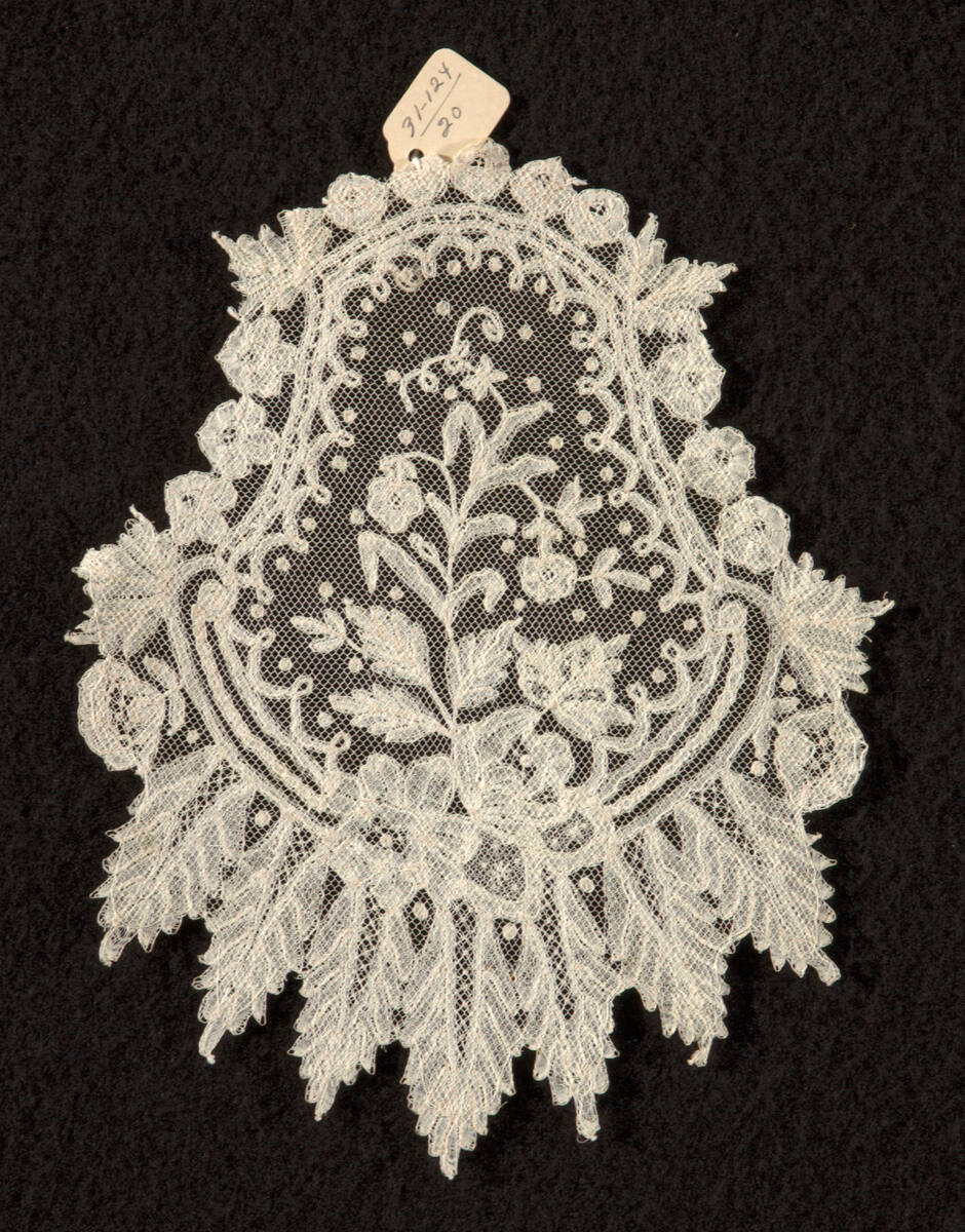 DescriptionThread lace with small floral design in center. Brussels application lace: bobbin-made part lace on a machine net ground. Coarse work.