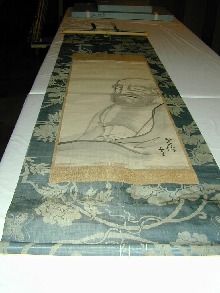 DescriptionHanging scroll with blue and gold floral mountings. Ink on paper depicts the torse of a bearded man with long hair and bushy eyebrows. The upper portion of the scroll is empty. Near the bottom of the scroll are a red seal and calligraphy.