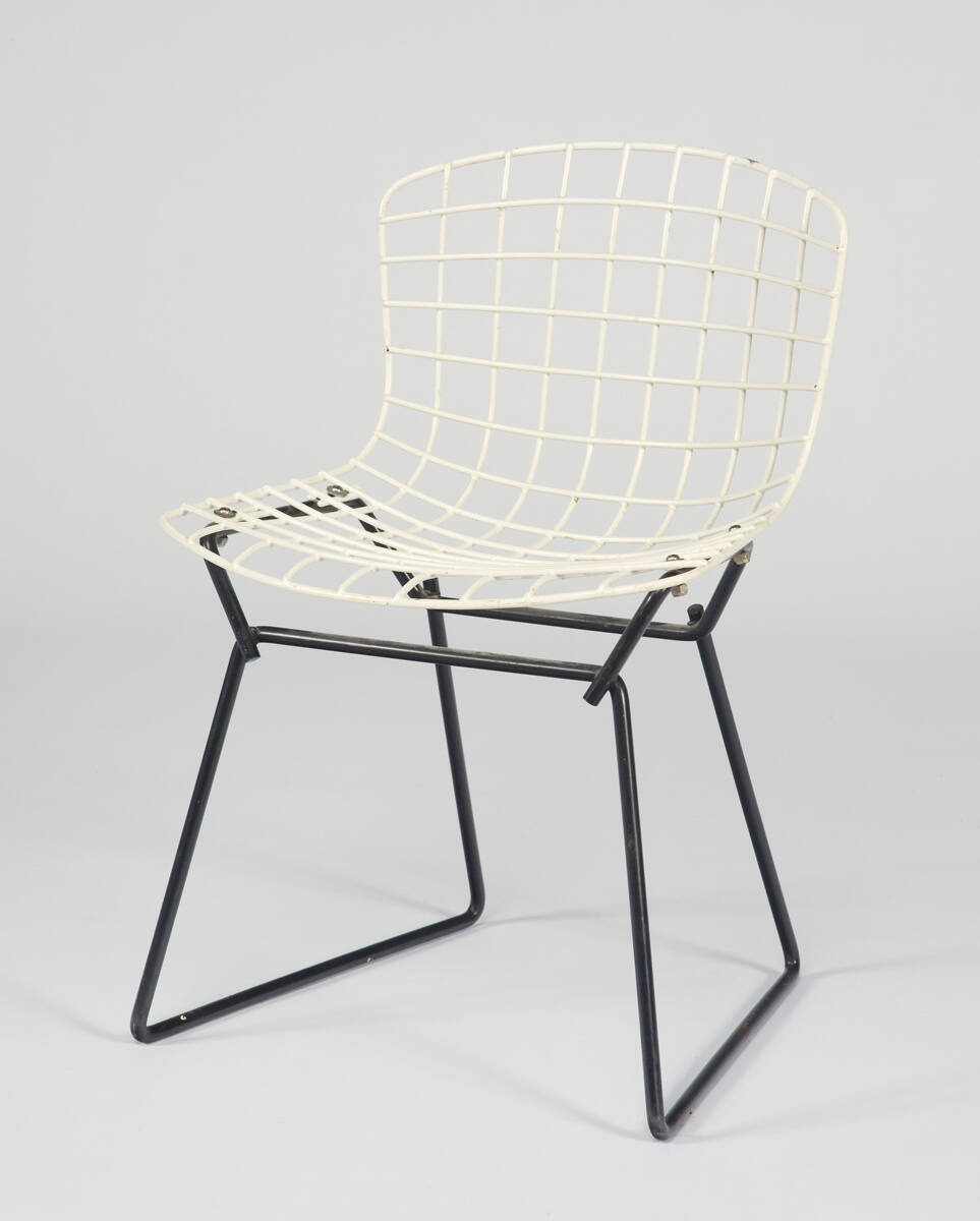 DescriptionThe upper section of the chairs is formed by vertical and horizontal ribs which are contoured to accomodate the curves of the human body. The ribs are covered with white plastic coating. The base of the chairs is formed by round tubes coated with black plastic. The chair pad is made of foam and covered in Naugahyde with a black textile backing. The chair cushion is not attached to the chair. Two chairs have orange chair pads, three have beige chair pads and the other chair does not have a chair pad.Copyright© Estate of Harry Bertoia / Artists Rights Society (ARS), New York