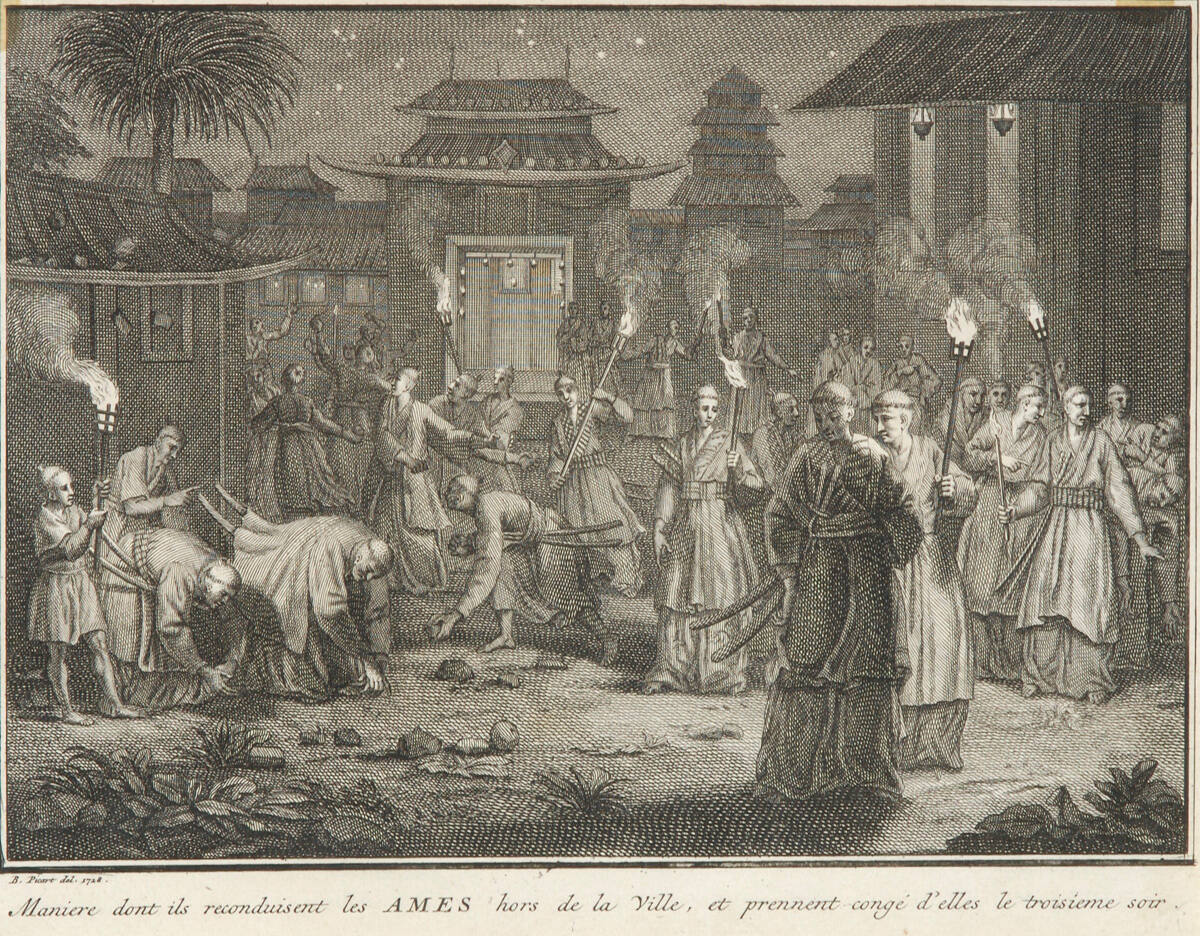 DescriptionNocturnal scene in compound with buildings, pagodas, lighted by hanging lamps; large group of robed men, some carrying torches, picking up stones, some which are thrown against wall of house.Exhibition HistoryOccidental Graphics from the Collection of Laurence Sickman, The Nelson-Atkins Museum of Art, Kansas City, MO, September 13- October 18, 1992, no. 21, as Souls Being Driven Out of Town.