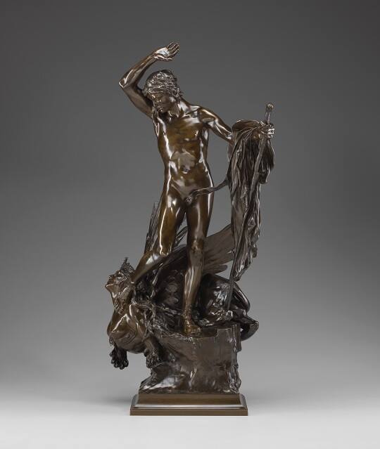 François-Léon Sicard’s idealized nudes and highly refined surfaces display the enduring Neoclassical tradition. The subject of this bronze, however, also reveals the influence of contemporary Symbolist artists and their fascination with the notion of the femme fatale, a woman who brings about a man’s demise through her sexuality—here embodied by the Sphinx.