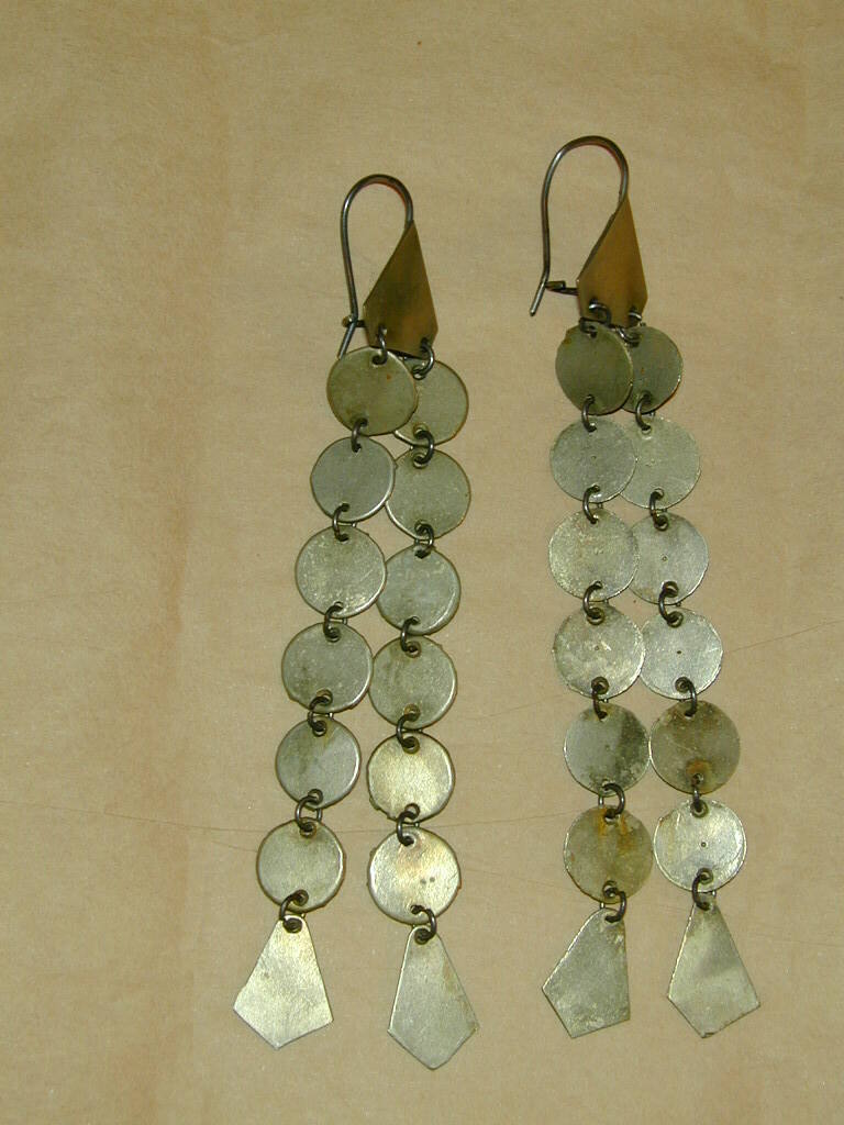 DescriptionSilver-colored earrings with double pendant, each consisting of six linked discs terminating in triangular form, suspended from a triangular base.