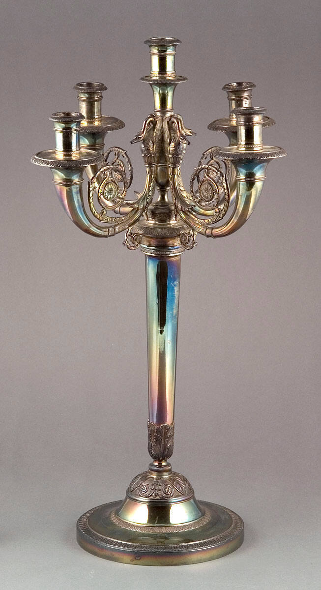 DescriptionFive light candelabra with circular, domed bases decorated with rased acanthus leaves and anthemion borders. Tapered central stem rises to support 4 branches and a central candle cup. Each branch is enhanced by a foliated spiral design. 4 swans terminate the curved of the candle branches at the stem.