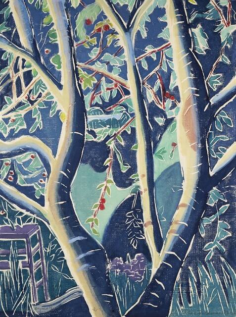 DescriptionOn blue ground in varying shades three half-lighted forked tree trunks extend top to bottom, branches between with leaves and cherries handing downward. Tall purple table, lower left corner; purple chairs, lower center; green chair tops and blue-topped table, upper centerCopyrightAline Feldman © 2004