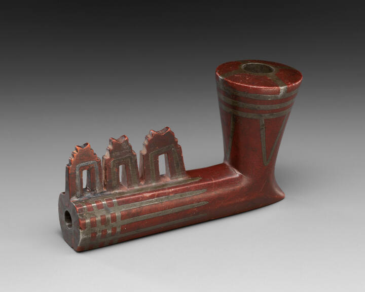 DescriptionDark red pipe bowl with dull gray lead inlaid design over surface; flaring bowl with three house-shaped forms along shaft.Gallery LabelMost Plains and Prairie pipe bowls from the post-European contact period were carved from catlinite, a soft, red-colored stone quarried in southwestern Minnesota. This bowl is elaborated with designs of lead inlay. The three architectonic forms comprising the crest along the shaft represent either houses or lodges that, together, appear to symbolize either a fort or village. The four lines at the top of the bowl were likely intended to represent the four sacred directions believed to converge at the ritual center of the universe.