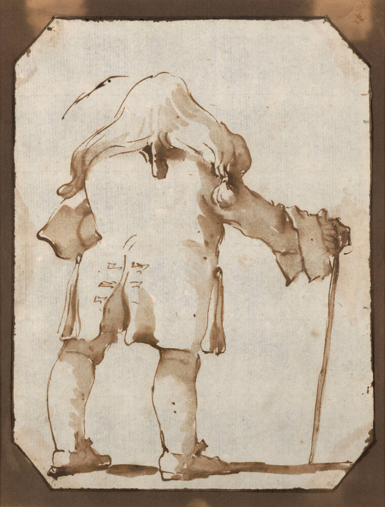 DescriptionThis drawing is executed in pen and brown ink with brown wash. It shows a man in 18th-century costume, seen from the back, leaning on a cane and wearing a long, flowing wig. The drawing is octagonal in shape with its corners cut.Exhibition HistoryCaricature, Fashion and Fantasy, The Nelson-Atkins Museum of Art, Kansas City, MO, June 18-December 14, 2014.