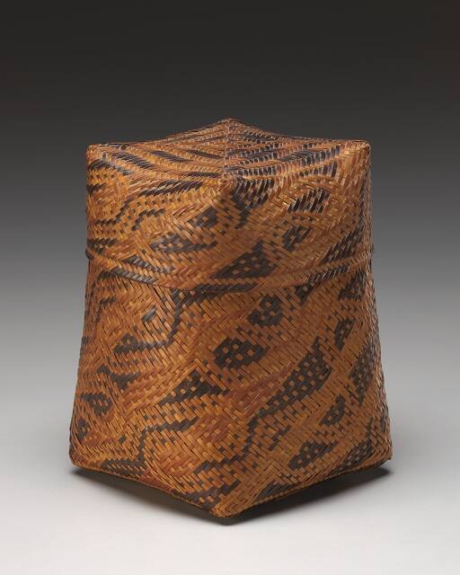 DescriptionLidded basket of vertical, rectangular form with gently curving sides; surface covered with design of meandering lines visually superimposed over diagonal light and dark bands.Gallery LabelThe Chitimacha of Louisiana are the acknowledged masters of woven polychrome baskets of dyed river cane. This superb example, with its beautifully controlled rectilinear shape and carefully fitted lid, is ornamented with a meandering, scroll-like pattern inspired by ancient Mississippian pottery designs. Called Nactcua-aki, the design is said to represent alligator entrails. Created with the simplest technique called plaiting, this polychrome basket represents the highest development of the form called double weave. Here, one basket is essentially woven inside another and the two are then interwoven at the rim.