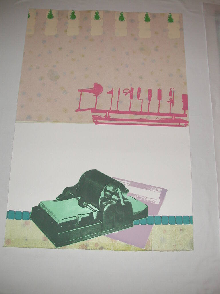 DescriptionBottom half: Green press on yellow ground, border behind of chamfered blue rectangles, purple plane at angle behind press. Top half: Bank of rose-colored lights, microphones, trumpet form on metal framework jutting from right margin. Seen against buff background with pale blue and yellow blotches overall at random. Top: Succession of green light bulb forms with yellow light swatches below.Copyright© Laura Crehuet Berman