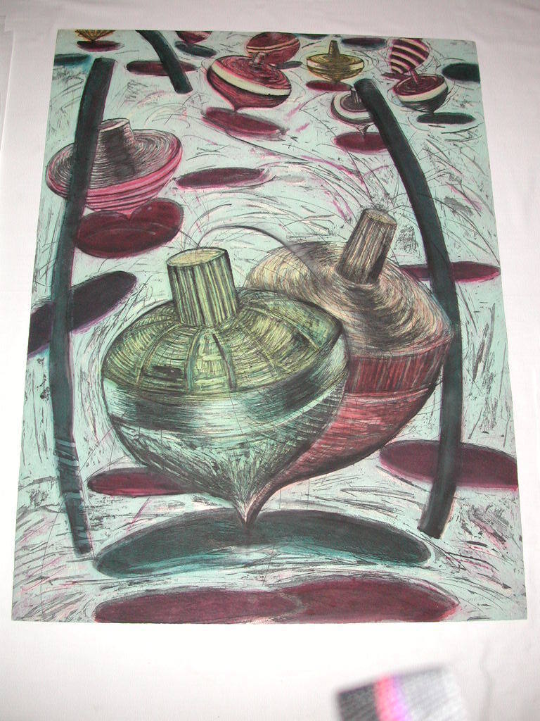 DescriptionOn pale green ground, succession of whirling tops, two largest at bottom, shadows beneath, and paths of movement indicated by black lines. Flanked by two thin curving black straplike forms.Copyright© Mary Ann Strandell