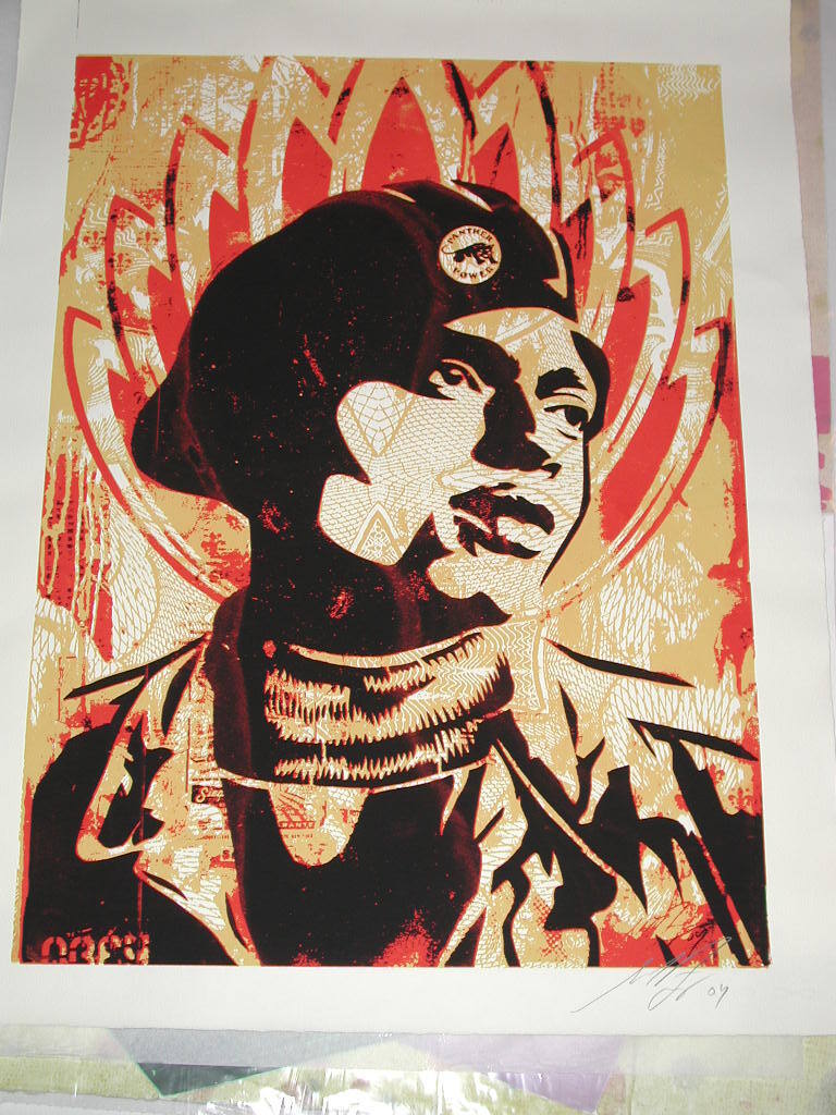DescriptionBust-length, three-quarter-right profile of man wearing beret bearing circular pin with animal and words Panther Power. Netlike yellow design on flesh and top of uniform. Head surrounded by pointed red curving crownlike forms. Red splotches on black areas. "OBEY" in red and yellow partial letters, lower left corner.Copyright© Shepard Fairey