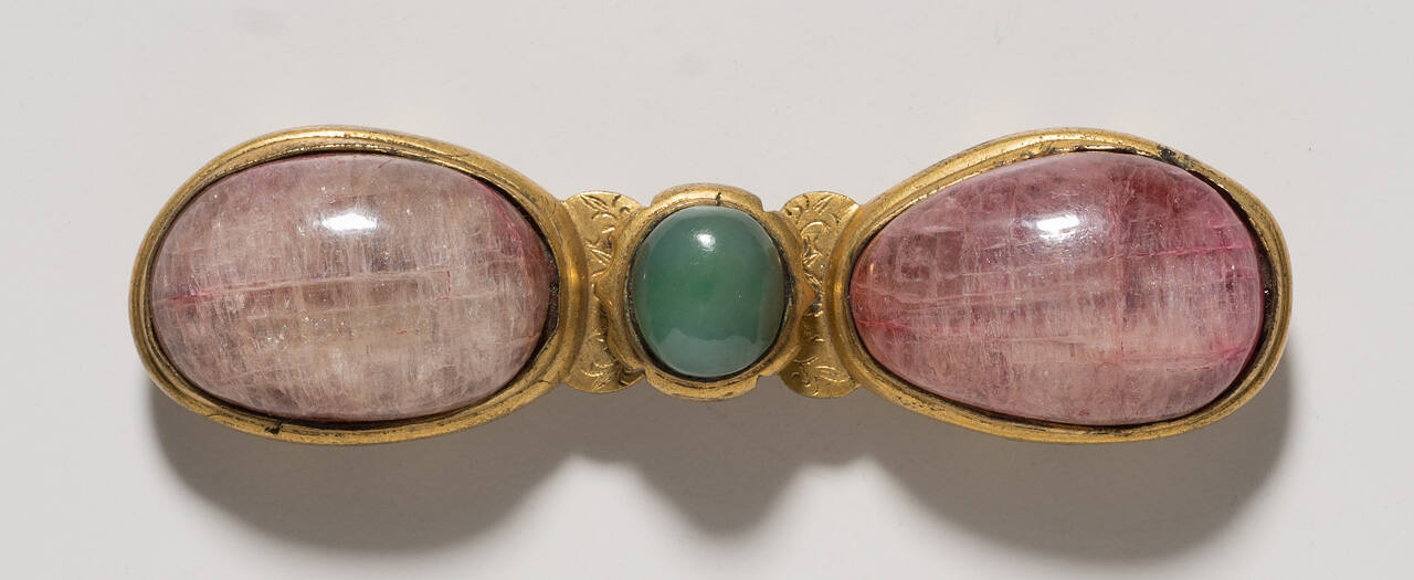DescriptionCarved crystal buckle in two pieces fastened by hook and button. Scroll design.