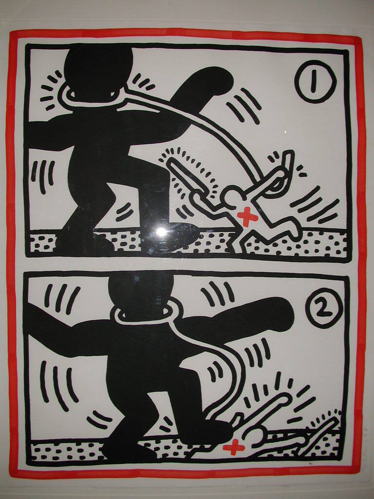 DescriptionThis lithograph is divided into upper and lower sections. The top half, designated by the number 1, depicts a solid black figural form with a rope around its neck. Below the black figure, is a smaller white figure, outlined in black and with a red X on its chest. In the lower segment, marked by the number 2, the solid black figure crushes the smaller white one with its foot.Copyright© The Keith Haring Foundation