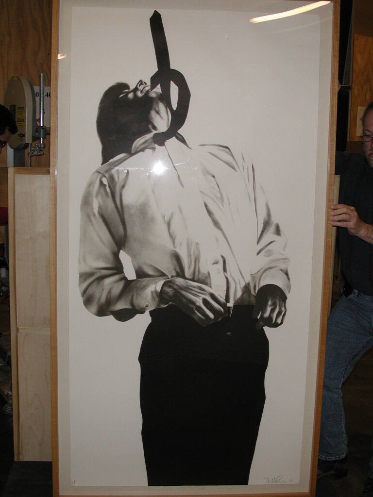 DescriptionThis lithograph depicts a man wearing a white shirt and black tie whose head is thrown back in a painfully contorted position. The tie flies up toward the uppermost part of the composition. The background is empty, white space.Copyright© Robert Longo