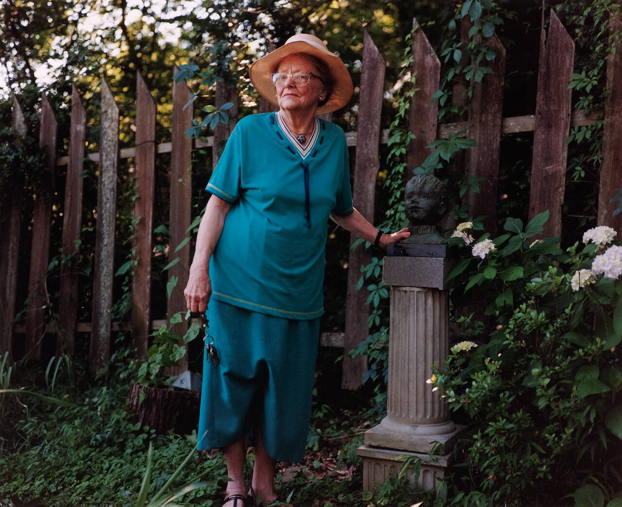 DescriptionImage of an older woman in a teal dress and straw hat standing in a garden beside a sculptural head on a column.