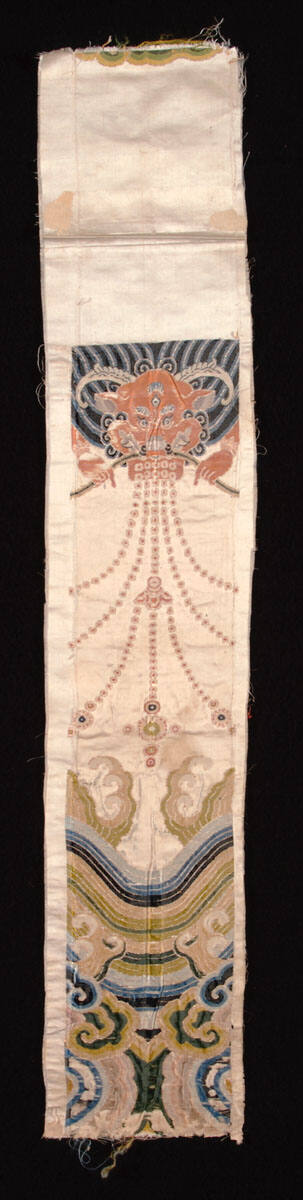 DescriptionPart of a Lama coat. White satin brocaded with red garuda with blue wings at top. Blue and green waves at bottom.