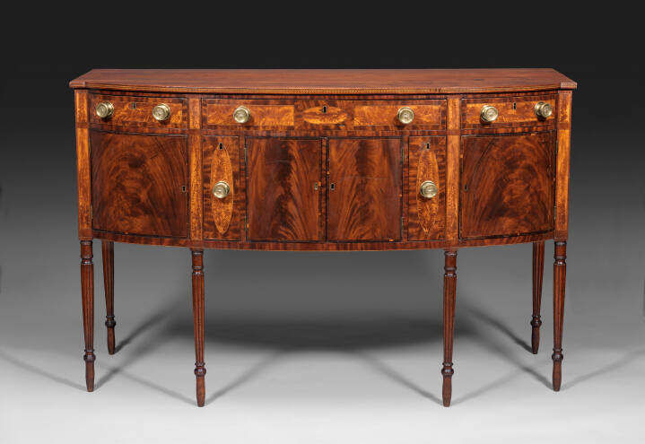 DescriptionSheraton type sideboard, inlaid and panelled in crotch mahogany, with fluted legs, curved front, and brass handle.Gallery LabelBeginning in the 1780s, sideboards, such as this example with richly figured mahogany and birch veneers, became an important piece of furniture in American dining rooms. English furniture designer George Hepplewhite wrote in his 1794 The Cabinet-Maker and Upholsterer's Guide: "The great utility of this piece of furniture has procured it a very general reception; and the conveniences it affords render a dining room incomplete without a sideboard." They provided both expansive surface for serving and ample storage for linens, silver and liquor-the two vertical, oval front drawers are partitioned to hold bottles. Often imported from England, knife boxes developed as a specialized piece of furniture, designed to be displayed on top of sideboards, as seen here.