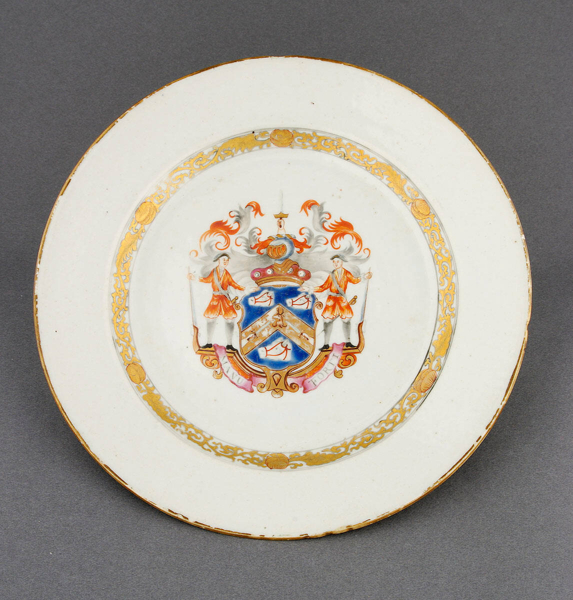 DescriptionPlate with Coat-of-Arms of Baron Reay Mackay in blue, red and gold, consisting of two red-coated figures with rifles on either side of escutcheon with bears the inscription MANU FORTI; gilt scroll and foliate border on cavetto; shoulder is plain except for narrow gold rim.