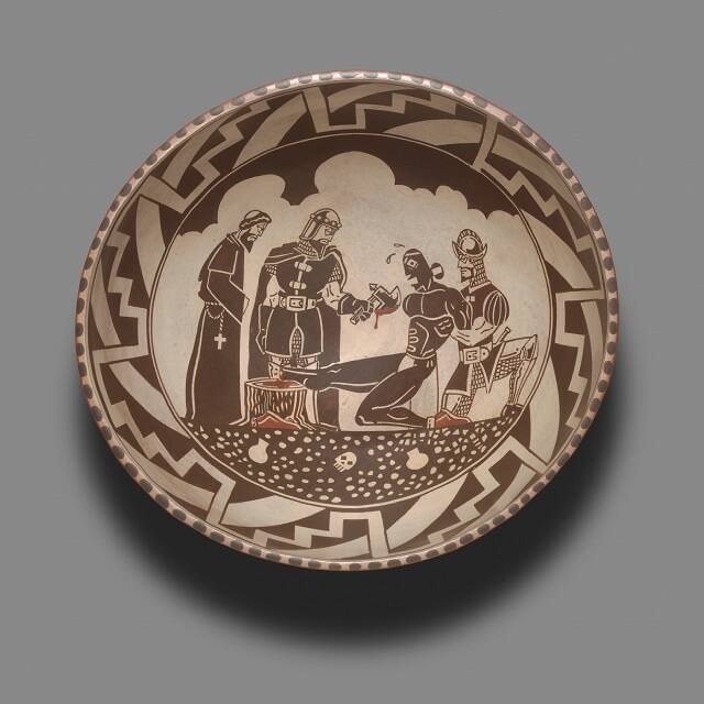 DescriptionDeep ceramic bowl with reddish-brown exterior, painted on the interior with an image, primarily black and white, of four figures within a landscape, enclosed within a geometric design.Gallery LabelThe content of Diego Romero's work covers a broad spectrum, including the most sensitive issues of politics, history, religion, ethnicity and personal struggle. One of his recurrent themes is the history of Colonial New Mexico and the conquest of Pueblo peoples. The subject of this work is a well-known episode that continues to resonate with Pueblo people today as a potent reminder of Spanish oppression. The image depicts two soldiers, accompanied by a priest, executing a sentence imposed upon a number of Acoma men in 1599 in retaliation for the deaths of soldiers killed at the Pueblo months earlier. More broadly, the work references the invasion of the Americas by European empires, the inevitable clash of cultures, the destruction and subjugation of indigenous peoples and the paternalism and brutality sometimes exercised by Church and State in achieving these ends.