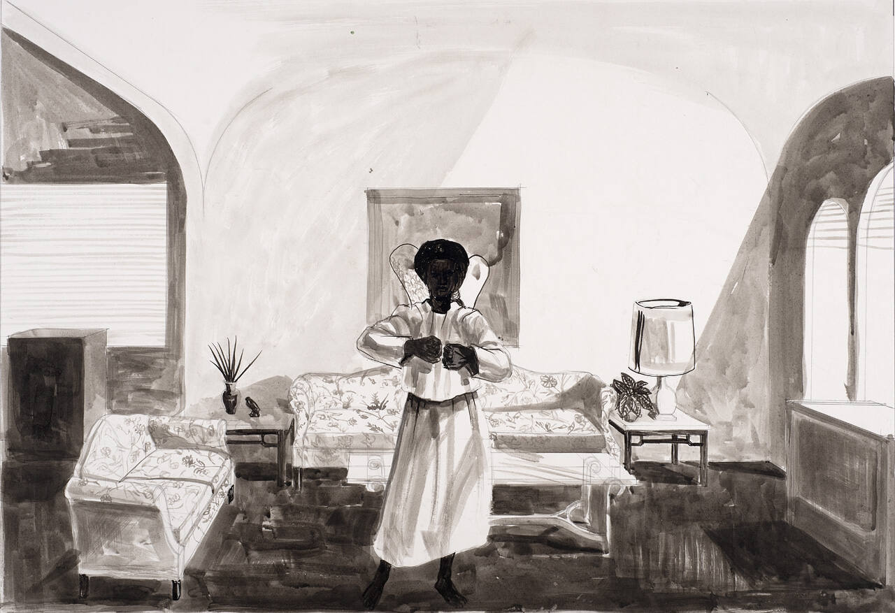 DescriptionThis image depicts a black woman standing in the center of a living room. She holds her hands together in the center of her chest and appears to have two small wings attached to her back.Copyright© Kerry James Marshall
