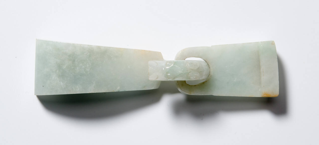 DescriptionWhite jade buckle of slightly green tint. Tongue of carved dragon head.