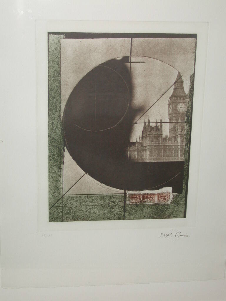 DescriptionPart of London's Houses of Parliament seen through circle, dark left and bottom, top left part of white circle in line. Mottled green border, left, bottom, and part right. Diagonal line from lower left corner to edge of circle, top right. Brown stamps with postmark, bottom right.Copyright© The Joseph and Robert Cornell Memorial Foundation/Licensed by VAGA at Artists Rights Society (ARS), New York