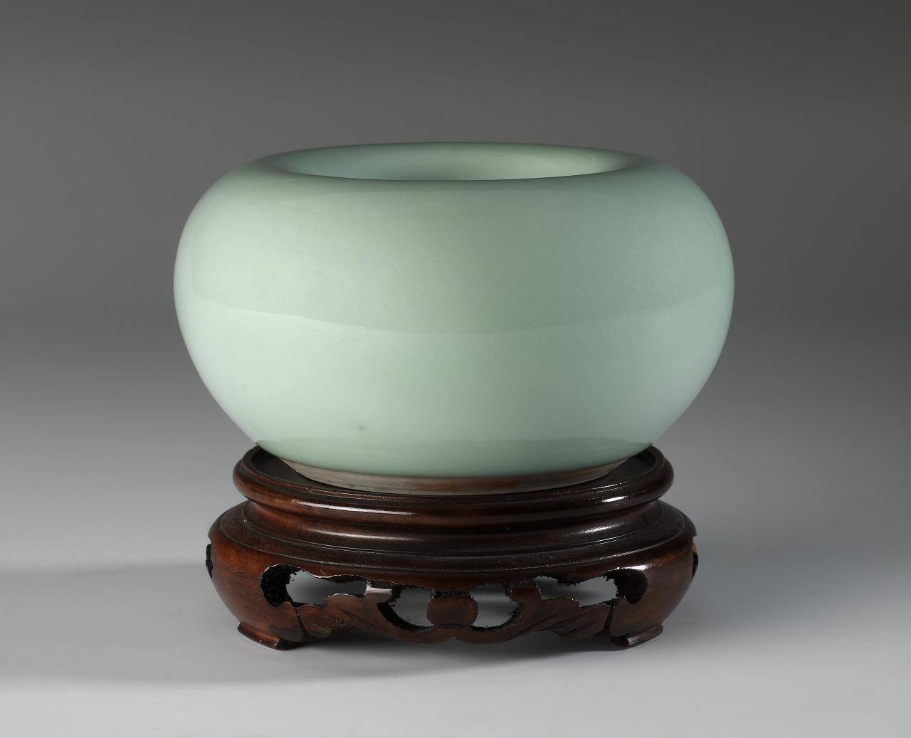 DescriptionThe light blue bowl has a wide, inward curving rim. It is smoothly glazed, and matched with a wood support. The support has open-work carvings.