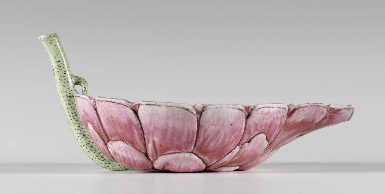 DescriptionThe ceramic vessel is a shallow, pink lotus-pattern bowl, with green stem-shaped holders. Chinese characters are inscribed on the spout.