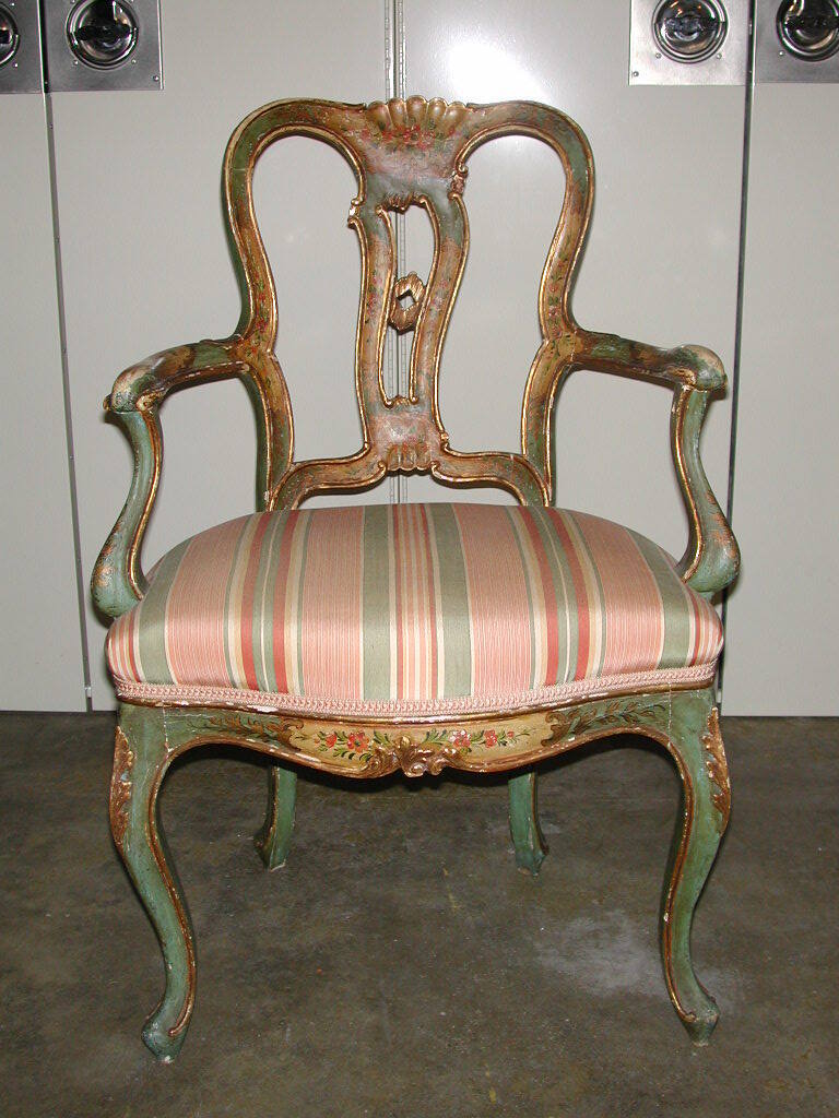 DescriptionArmchair with cabriolet legs echoed in the curving arms with open backs painted primarily in green with cartouches of cream-colored paint highlighted and outlined with gold paint and sprays of flowers. The modern upholstery is of pink and green striped material.