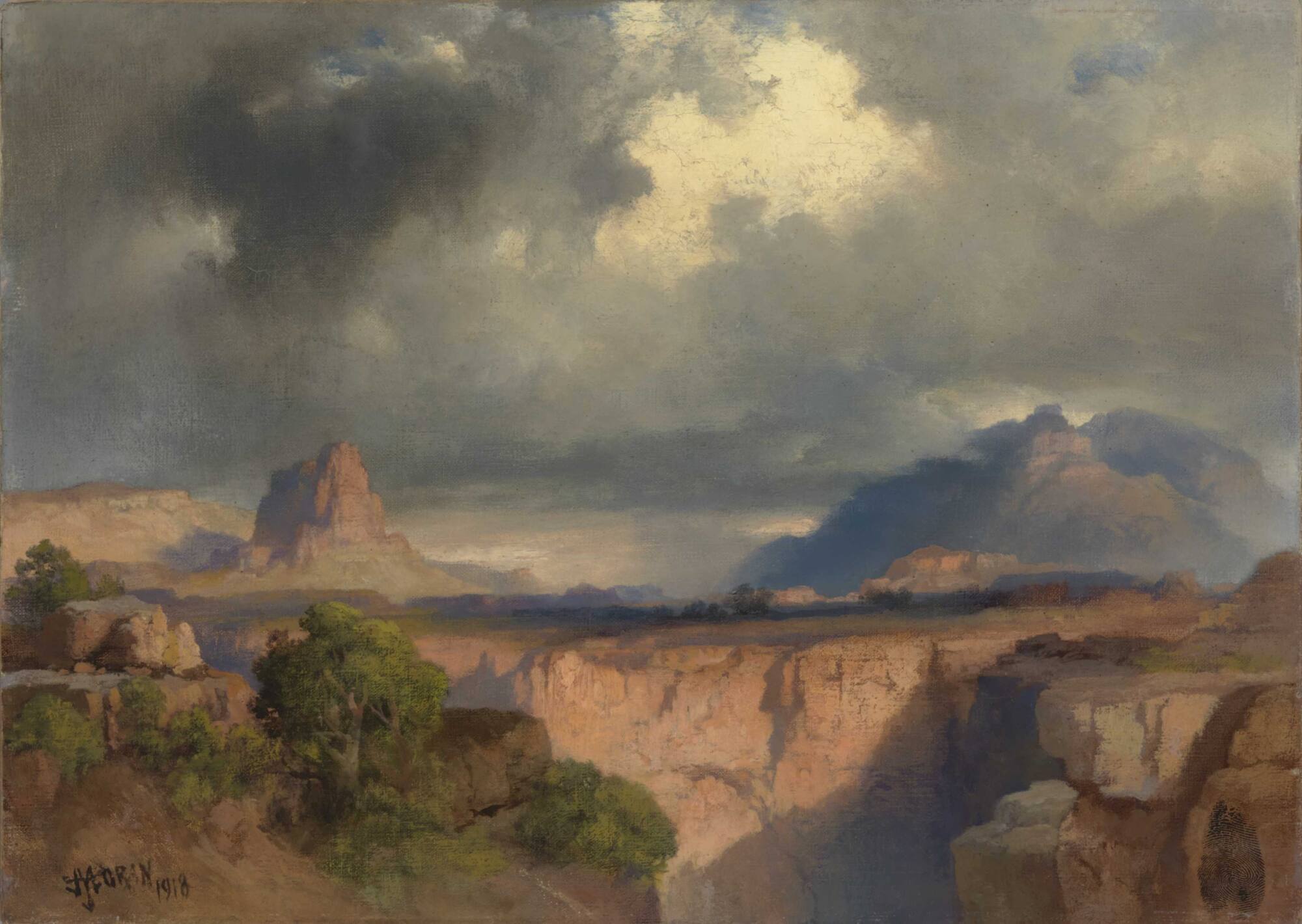 DescriptionThis painting shows a panoramic landscape with fairly dark overhanging clouds. A deep canyon (the bottom of which is not visible) stretches forward toward the viewer. Much of the light in the composition strikes the walls of the canyon, thus drawing attention to it. The view reaches deep into the distance, where several promontories can be seen.