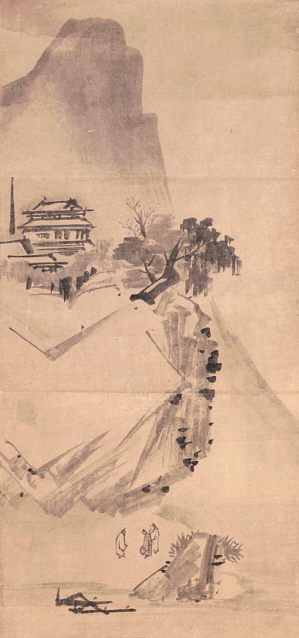 DescriptionThe painting is a landscape in ink monochrome. It features a gathering of three gentlemen in a mountain scene.