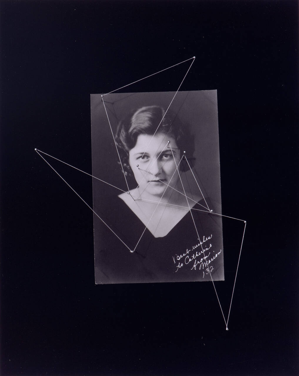 This work depicts a "found" photograph of a woman with an arrangement of string and pins placed overtop.