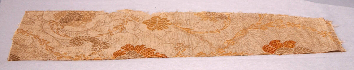 DescriptionRepeated conventionalized design of flowers, apricot, silver, and cream on a silver background.