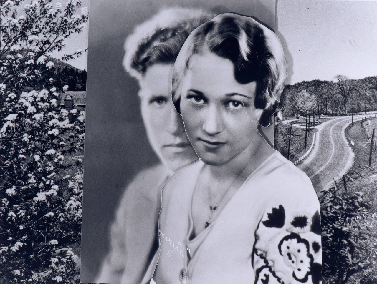This work depicts several overlapping "found" photographs: a central image of a man and woman, with landscape images at both left (trees) and right (field with road).
