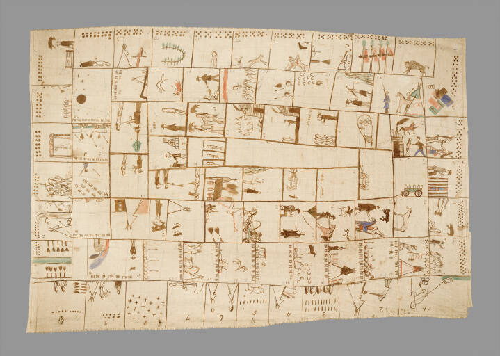 Winter counts are pictorial, sequential histories created within a number of Plains tribes. Each image—symbol, object, figure or scene—represents an event by which an entire year, or winter, is counted and recorded in the history of the group. Framed within rectangles and organized as an inward-turning spiral, these images served as a memory aid for the keeper of the count, who could recite the history they represented to others. In this way, all important personal and tribal events were recalled and placed in time relative to what had been documented in the images. The keeper’s narrative, an oral tradition, was an essential component in relating the meaning of each drawing. This count spans the years 1826 to 1902.