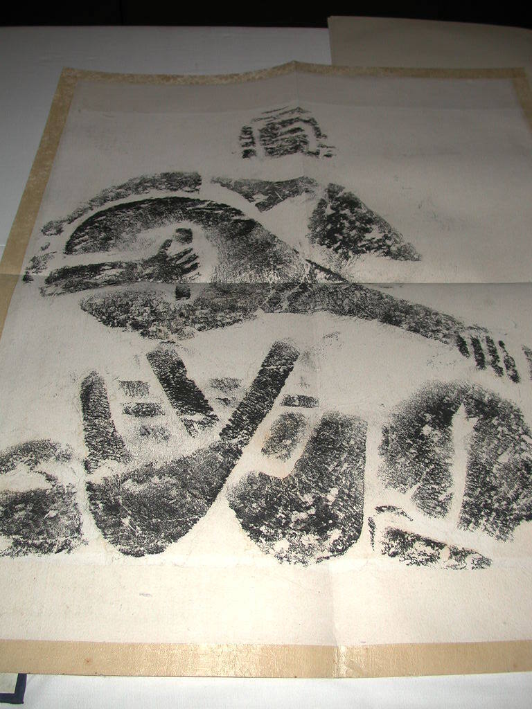 DescriptionMan playing guitar/string instrument. Box labeled "Kung Hsien". Rubbing taken from Kung Hsien (Gong Xian) caves.