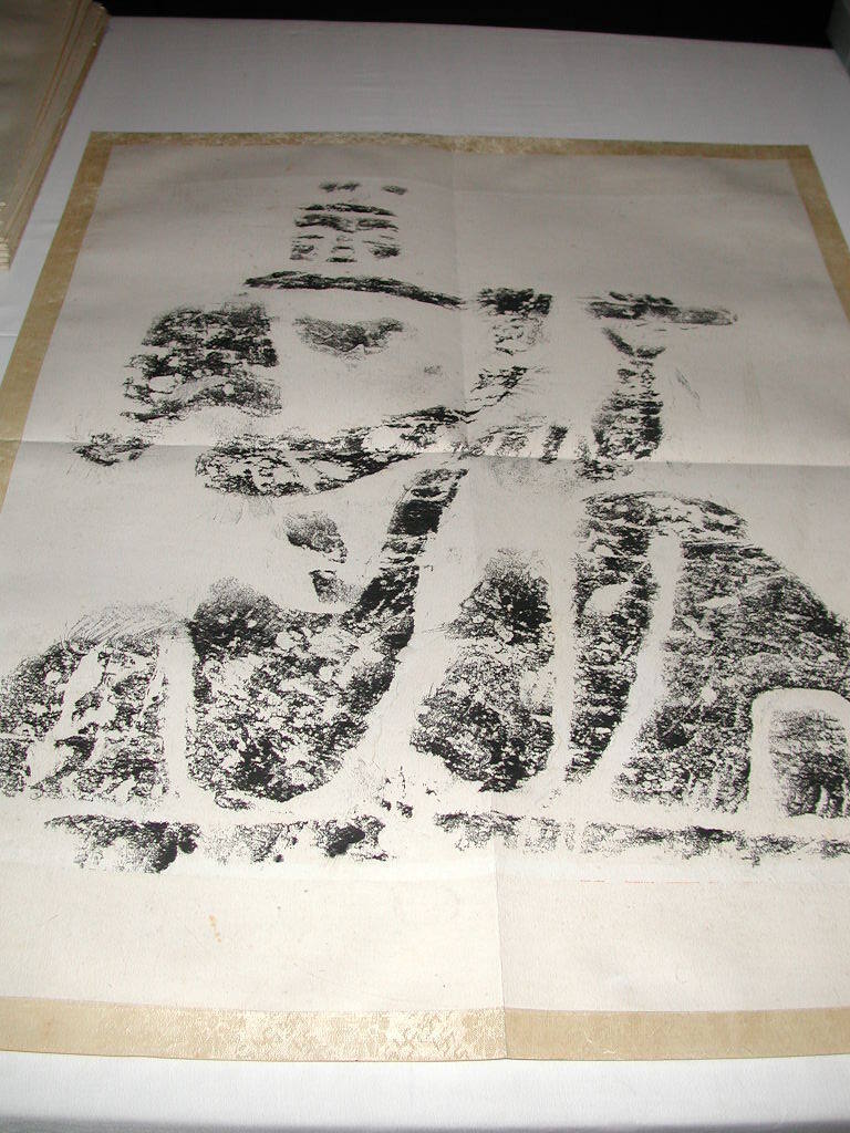 DescriptionMan playing long instrument (flute?). Box labeled "Kung Hsien". Rubbing taken from Kung Hsien (Gong Xian) caves.
