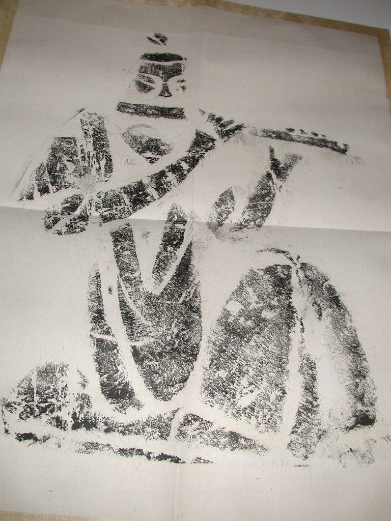 DescriptionMan playing a wind instrument. Box labeled "Kung Hsien". Rubbing taken from Kung Hsien (Gong Xian) caves.