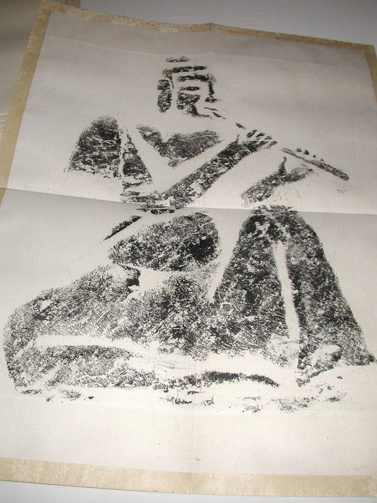 DescriptionMan playing a wind instrument. Box labeled "Kung Hsien". Rubbing taken from Kung Hsien (Gong Xian) caves.