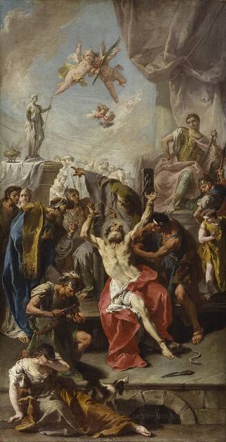 [1] Schulenburg commissioned several paintings from Pittoni, who also acted as an agent and restorer for Schulenburg’s collection. According to a 1738 inventory, Schulenburg bought a painting titled Martirio de San Bartolomeo copiosissimo di Figure from Pittoni on July 9, 1737. The dimensions given in the inventory do not match those of NAMA’s painting, but the sizes in the Schulenburg archive are not always accurate. The last mention of the Schulenburg Martirio de San Bartolomeo is in a 1750 catalogue of the collection.