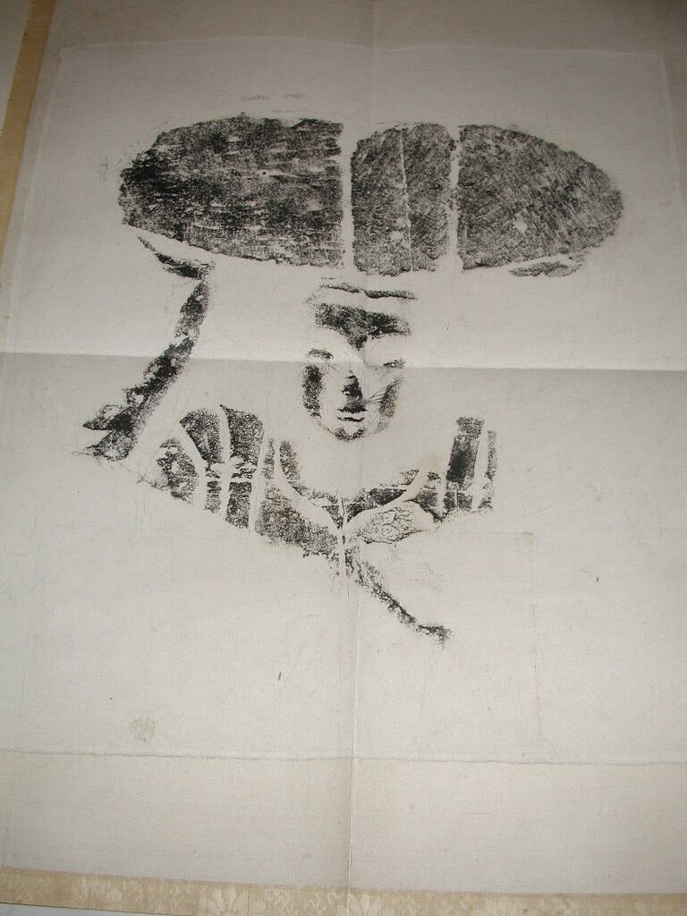 DescriptionFigure carrying a bundle over head. "Kung Hsien". Rubbing taken from Kung Hsien (Gong Xian) caves.