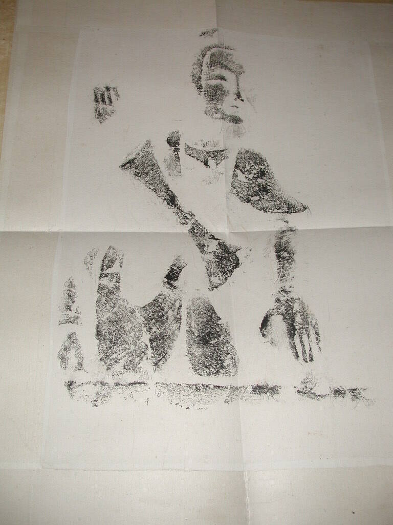 DescriptionFigure with object strapped across his chest (?). "Kung Hsien". Rubbing taken from Kung Hsien (Gong Xian) caves.