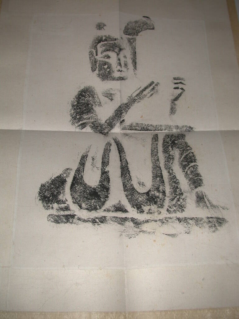 DescriptionFigure holding object above proper left shoulder and resting the object on his knee. "Kung Hsien". Rubbing taken from Kung Hsien (Gong Xian) caves.