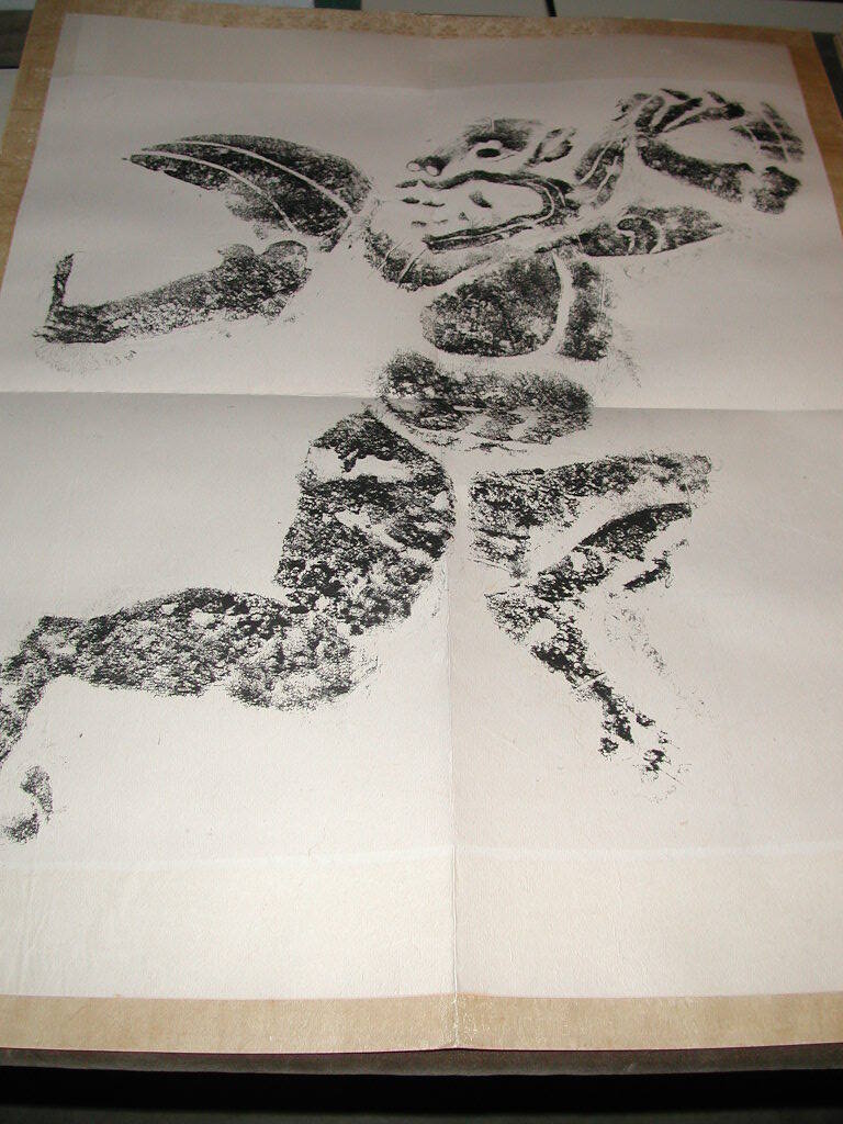DescriptionAnimal figure with warrior armor plates and open mouth. "Kung Hsien". Rubbing taken from Kung Hsien (Gong Xian) caves.