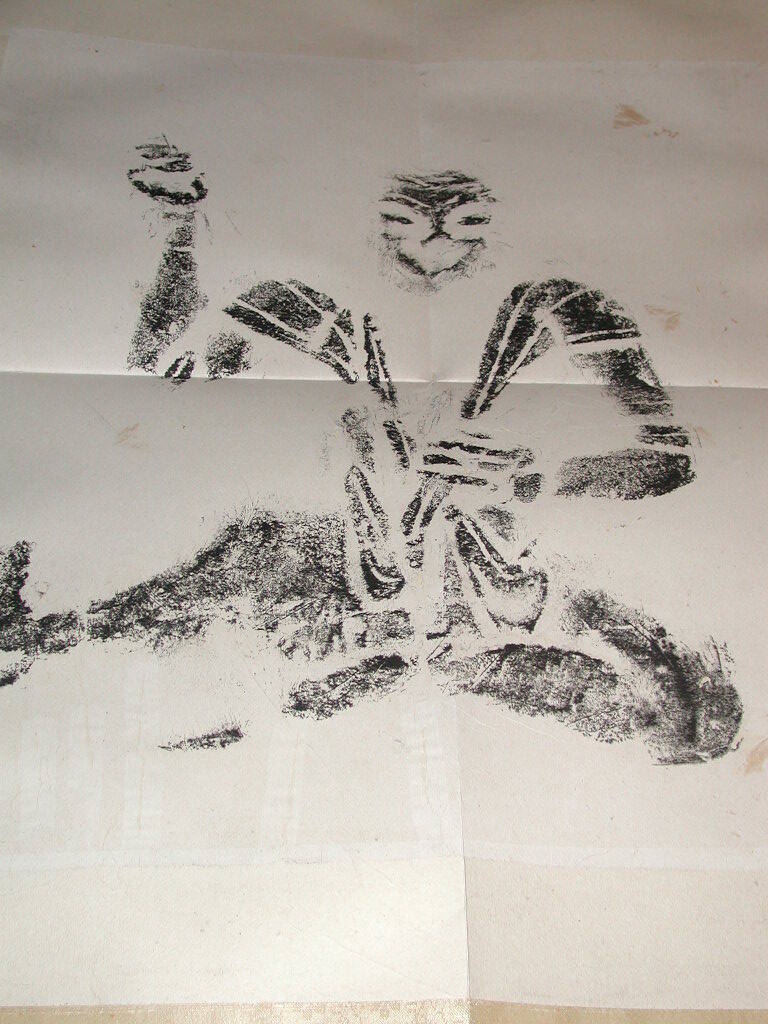 DescriptionSeated male figure with raised proper right arm. "Kung Hsien". Rubbing taken from Kung Hsien (Gong Xian) caves.