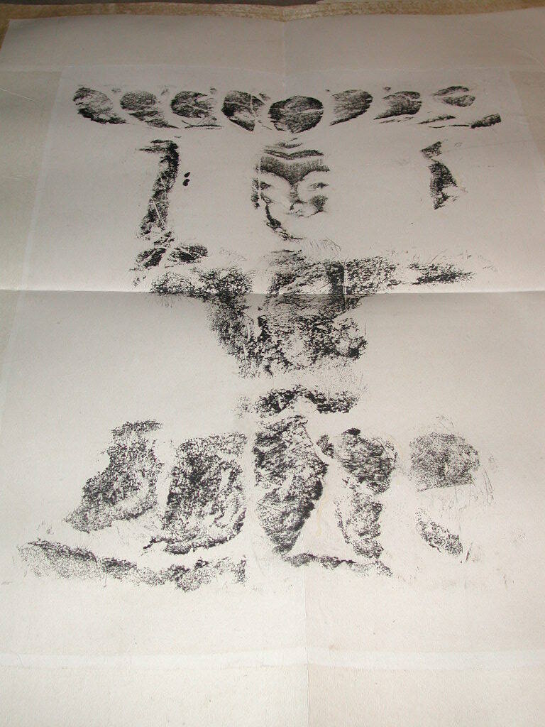 DescriptionMan with bundle over head. "Kung Hsien". Rubbing taken from Kung Hsien (Gong Xian) caves.