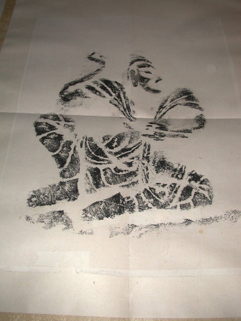 DescriptionSeated figure with bent knee, profile facing right, hand in air. "Kung Hsien". Rubbing taken from Kung Hsien (Gong Xian) caves.