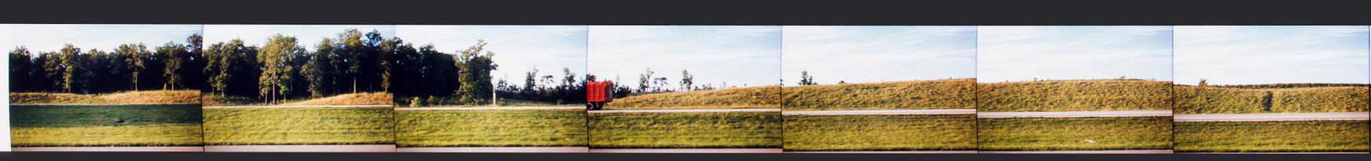 DescriptionA continuous print-out of an extended roll of frames shot by the artist from a car window while driving on the highway in Iowa. The various subjects include overpass bridges, passing cars, and fields of corn and wheat.Gallery LabelUnrolled, this photograph measures 108 feet long. It is composed of almost 250 individual images combined on a single strip of industrially produced photograph paper originally intended for the bulk printing of individual 3 x 5 in. snapshot photographs.
