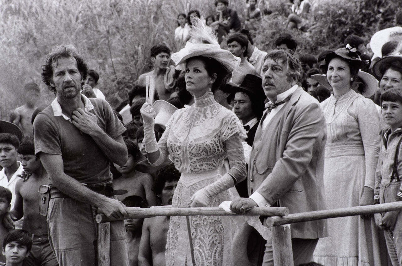 DescriptionWoman in white Victorian costume and feathered hat, flanked by two men and a hillside of native extras.Copyright© Beat Presser