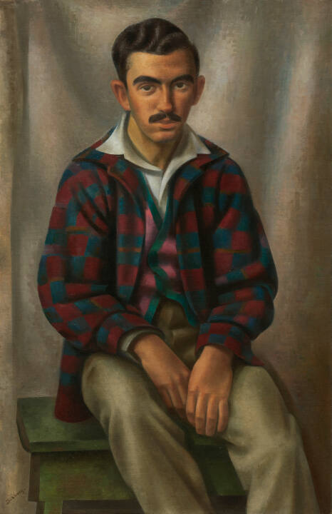 DescriptionFrontal figure of black-haired and mustachioed man seated on green bench before flat grey background, wearing open-collared white shirt, blue and red plaid jacket, over pink sweater with blue trim, grey trousers. Hands resting between legs, seen a little more than knee-length.Gallery Label
